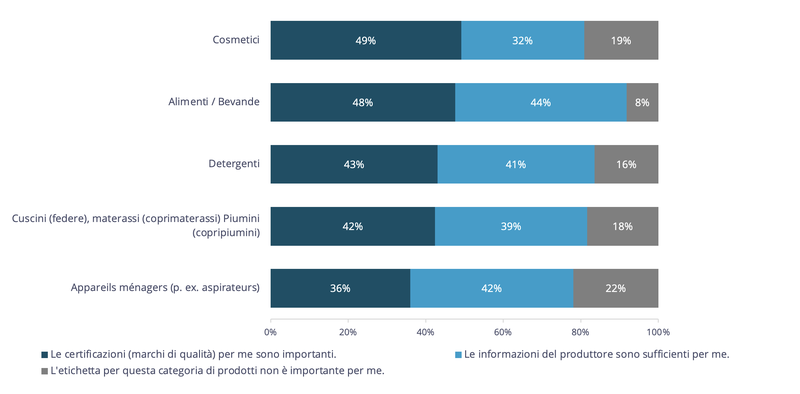 Le persone che prestano attenzione all'etichettatura attribuiscono particolare importanza ai marchi di qualità per i cosmetici. Nel caso di alimenti e bevande, sia i marchi di qualità che le informazioni specifiche sui prodotti fornite dai produttori sono di grande importanza.