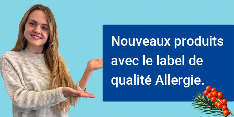 Des produits sans gluten et/ou sans lactose, tels que les yogourts sans sucre, une margarine végane, une mayonnaise végane et diverses boissons à l'avoine, ont récemment obtenu le label de qualité Allergie. De nouveaux produits de soin pour peaux sensibles sont également disponibles pour les bébés et les jeunes enfants. Ces produits sont sans parfum, sans fragrance, sans colorant et ne contiennent aucun des 26 composés allergènes. Jetez un œil aux produits.