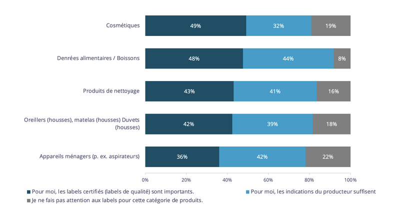Les personnes qui font attention à l'étiquetage attachent une importance particulière aux labels de qualité pour les produits cosmétiques. Pour les produits alimentaires et les boissons, les labels de qualité ainsi que les indications spécifiques aux produits fournies par les fabricants sont d'une grande importance.